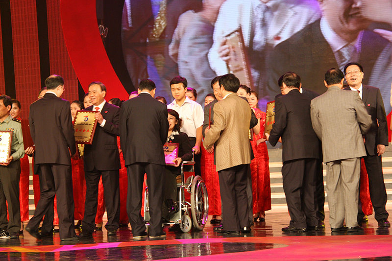 10月11日,阮加春總經(jīng)理在第八屆全國殘運會倒計時一周年大型愛心助殘晚會上接受中國殘聯(lián)主席張海迪(坐輪椅者)頒發(fā)“愛心企業(yè)”獎牌。浙江省省長呂祖善等領(lǐng)導(dǎo)出席了本次活動。