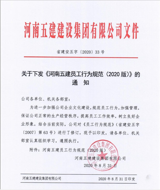 關(guān)于下發(fā)《河南五建員工行為規(guī)范(2020版)》的通知